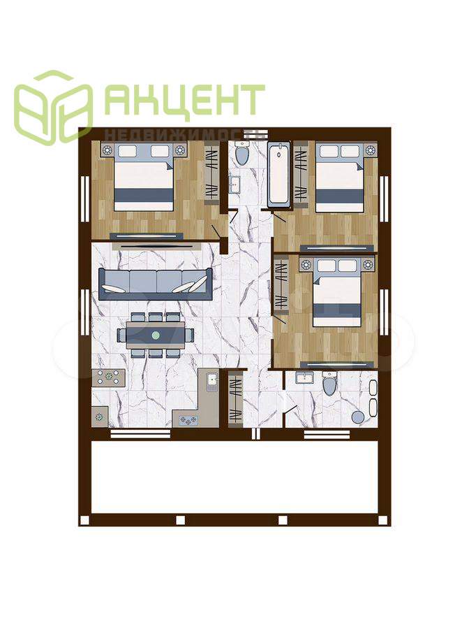 3 отдельных комнаты (15, 14 и 12 кв.м).