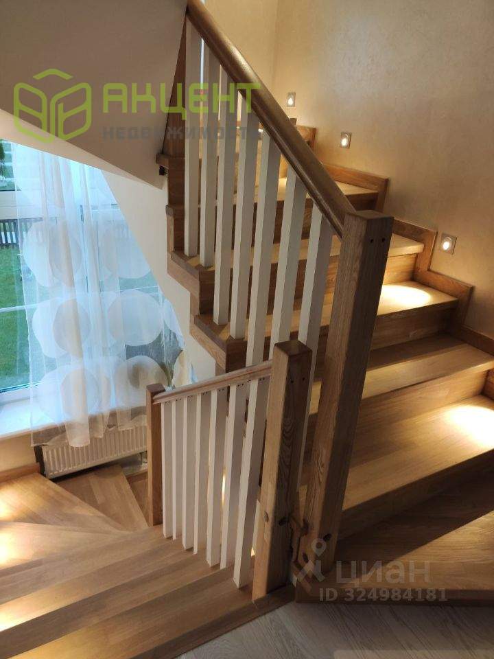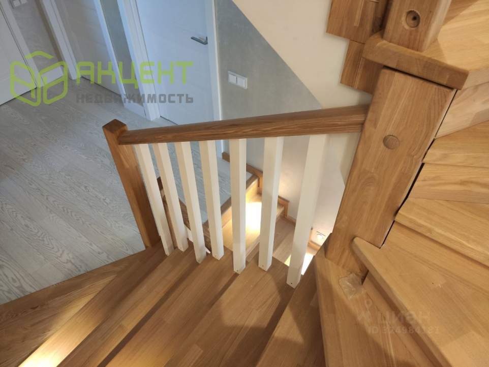 Монолитная лестница обшита ясенем, ограждения также выполнены из натурального дерева. Установлена дверь на лестнице с первого этажа.