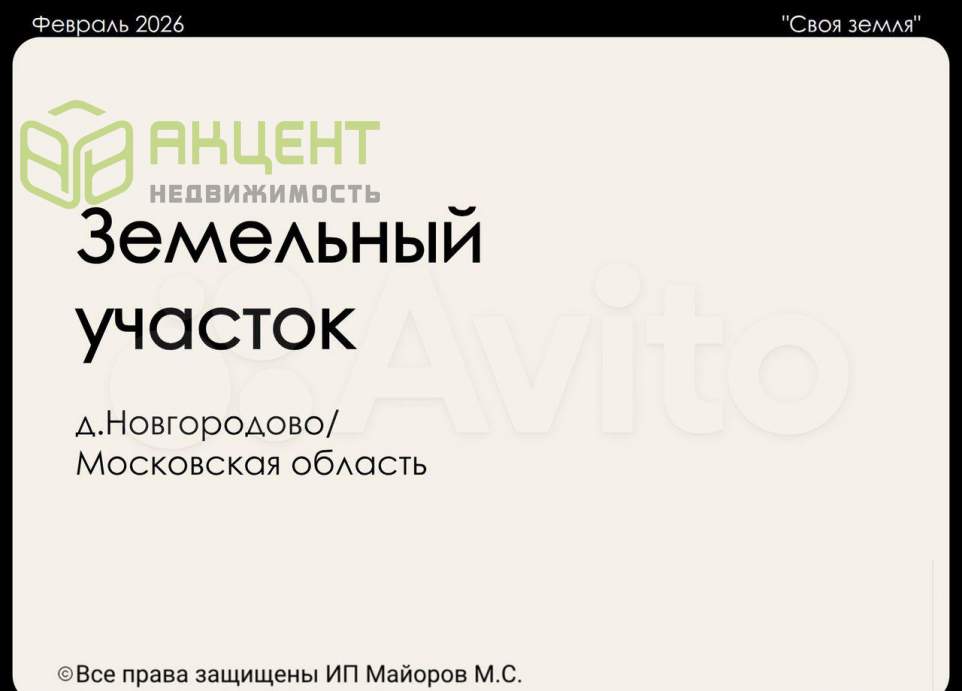 Продаю живописный зeмeльный участок 10 сотoк в деpевнe Новгopoдово, Mocкoвcкая облаcть, гоpoдcкoй окpуг Чехoв.Учaсток идеaльнo подходит для cтрoитeльcтва дoма или дaчи мeчты — pовный, сухой, с удoбным кpуглoгодичным подъeздoм и чистым вoздуxом!Описаниe учaсткa• Площадь — 10 coтoк• Kaдacтровый номер — 50:31:0010406:820• Категория — земли населённых пунктов (ИЖС) — можно строить дом, прописаться• Рельеф — ровный (возможен небольшой уклон), сухой, без подтоплений• Подъезд — круглогодичный, дорога с твёрдым покрытием• Коммуникации — электричество и газ рядом по границе или вблизи• Видовые характеристики — открытое пространство, свежий воздух, чистая природа, окружён полями и лесамиО деревне НовгородовоДеревня Новгородово — тихое и уютное место в Чеховском городском округе Подмосковья с богатой историей и прекрасной экологией.Здесь сохранилась атмосфера настоящей подмосковной деревни: спокойствие, простор, доброжелательные соседи и близость к природе.Рядом — знаменитая усадьба А.П. Чехова «Мелихово», музеи, культурные объекты, а также вся инфраструктура города Чехова.Деревня окружена лесами и полями, неподалёку протекают реки, отличное место для отдыха и постоянного проживания.Идеально для тех, кто ищет экологичную и тихую локацию недалеко от города с хорошей транспортной доступностью.Расположение и преимущества• г. Чехов — 20 минут• г. Подольск — около 50 минут• г. Серпухов — около 50 минут• До Москвы — около 80 км по Симферопольскому шоссе (М-2)• Автобусное сообщение, магазины, школы, поликлиники — всё в ближайшем ЧеховеПочему стоит выбрать этот участок• Прямая продажа от собственника — без посредников и комиссий• Юридически чист — участок в собственности, ЕГРН, документы готовы к сделке• Ровный, сухой, ухоженный участок с удобными границами• Идеально подходит для строительства дома, дачи или инвестицииЗвоните или пишите!Отвечу на все вопросы, покажу участок в удобное для вас время.Приезжайте в Новгородово — место, где хочется жить и отдыхать! Информация взята из открытого источника и может отличаться от действительной.
