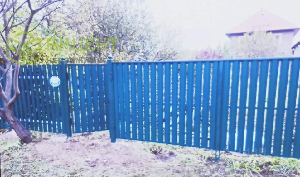 По лицевой стороне свежий забор из евроштакетника с калиткой и воротами. Информация взята из открытого источника и может отличаться от действительной.